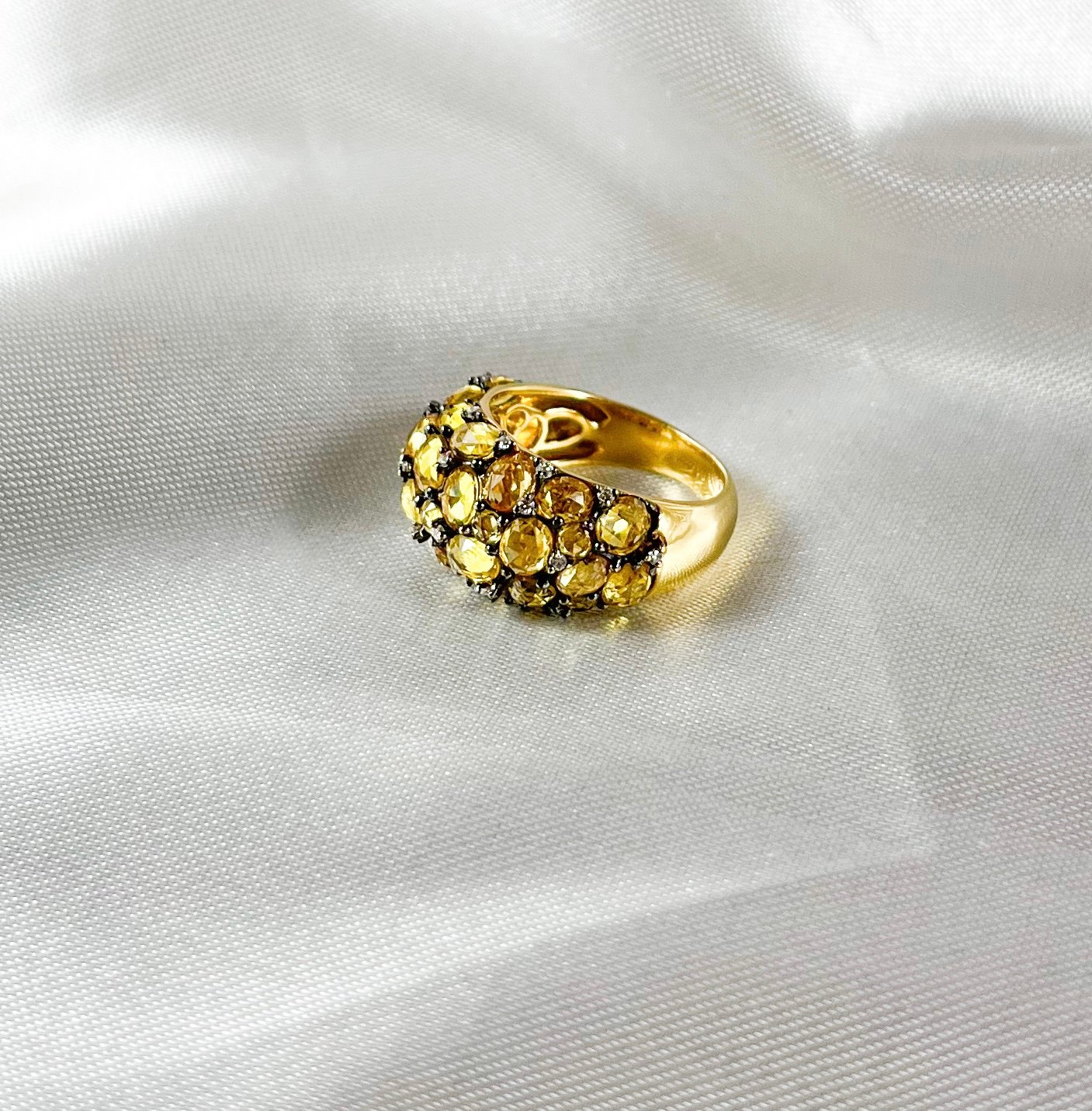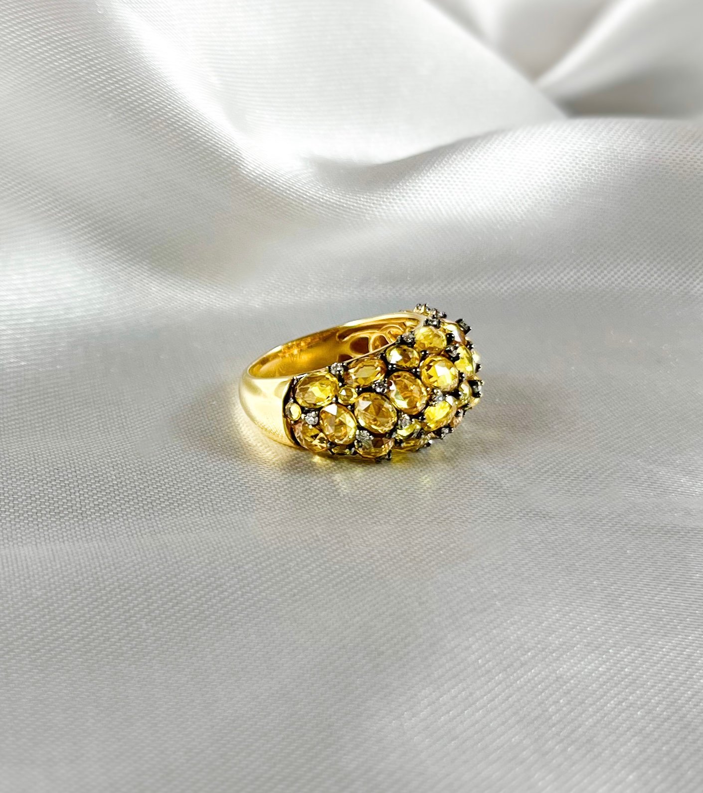 El Anillo de Citrinos con Diamantes presenta una superficie compuesta por múltiples citrinos de talla ovalada, dispuestos en forma agrupada y fijados con diamantes naturales entre cada piedra. La estructura curva aporta volumen y presencia, manteniendo un acabado sobrio con detalles de alto nivel.
