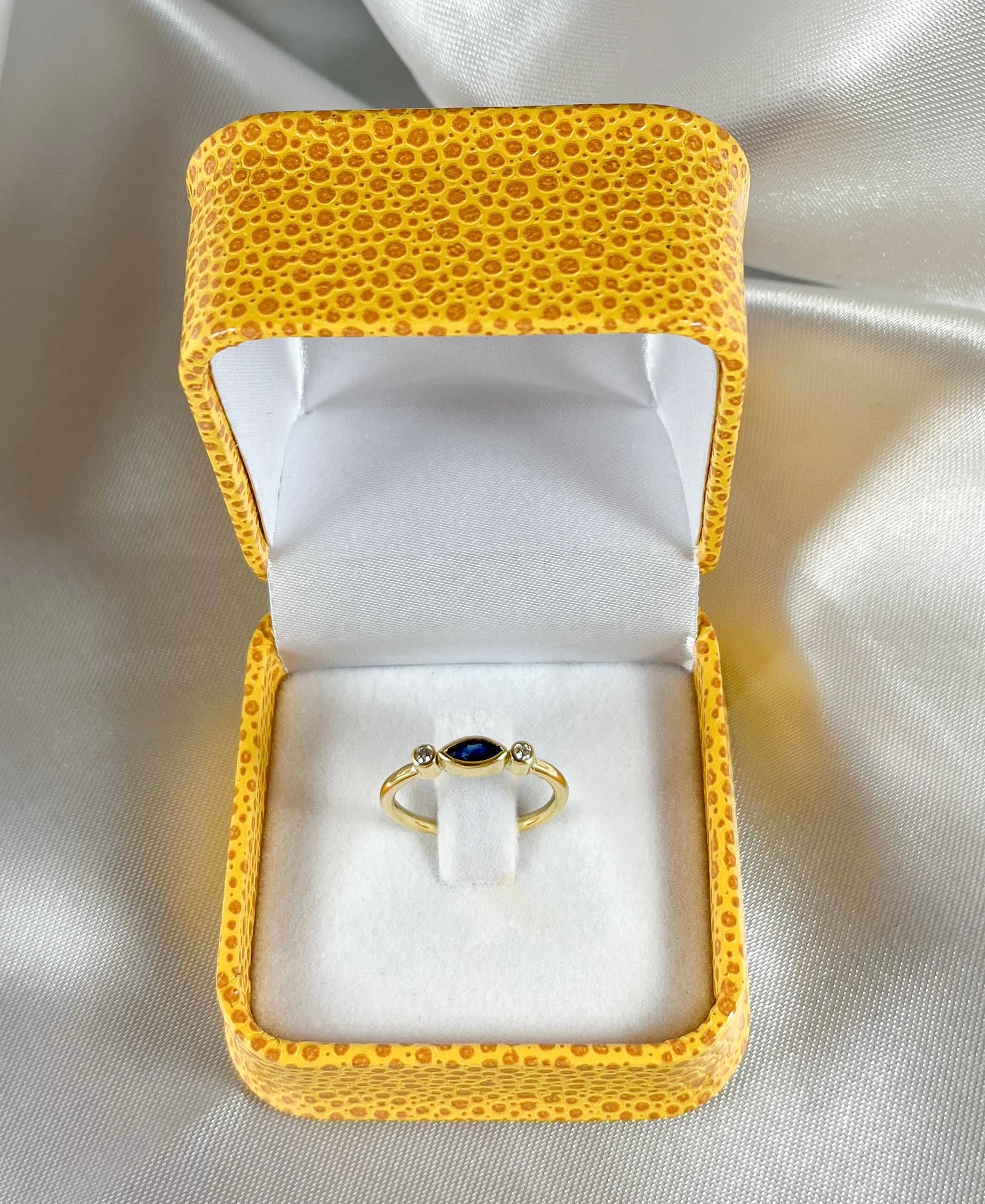 Una joya que irradia distinción y color profundo. Este delicado Anillo de Oro Amarillo se destaca por su vibrante Zafiro Central en corte marquesa, enmarcado por dos Diamantes que aportan el brillo justo.