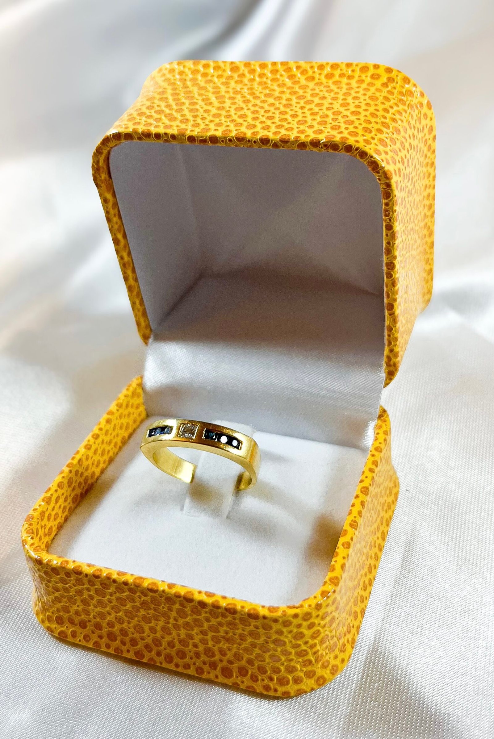 Una declaración de elegancia moderna y audaz. Este Anillo de Oro Amarillo presenta un Diamante Central de Corte Princesa o Cuadrado, flanqueado a cada lado por Zafiros de intenso color azul. El engaste invisible confiere un acabado limpio y contemporáneo.