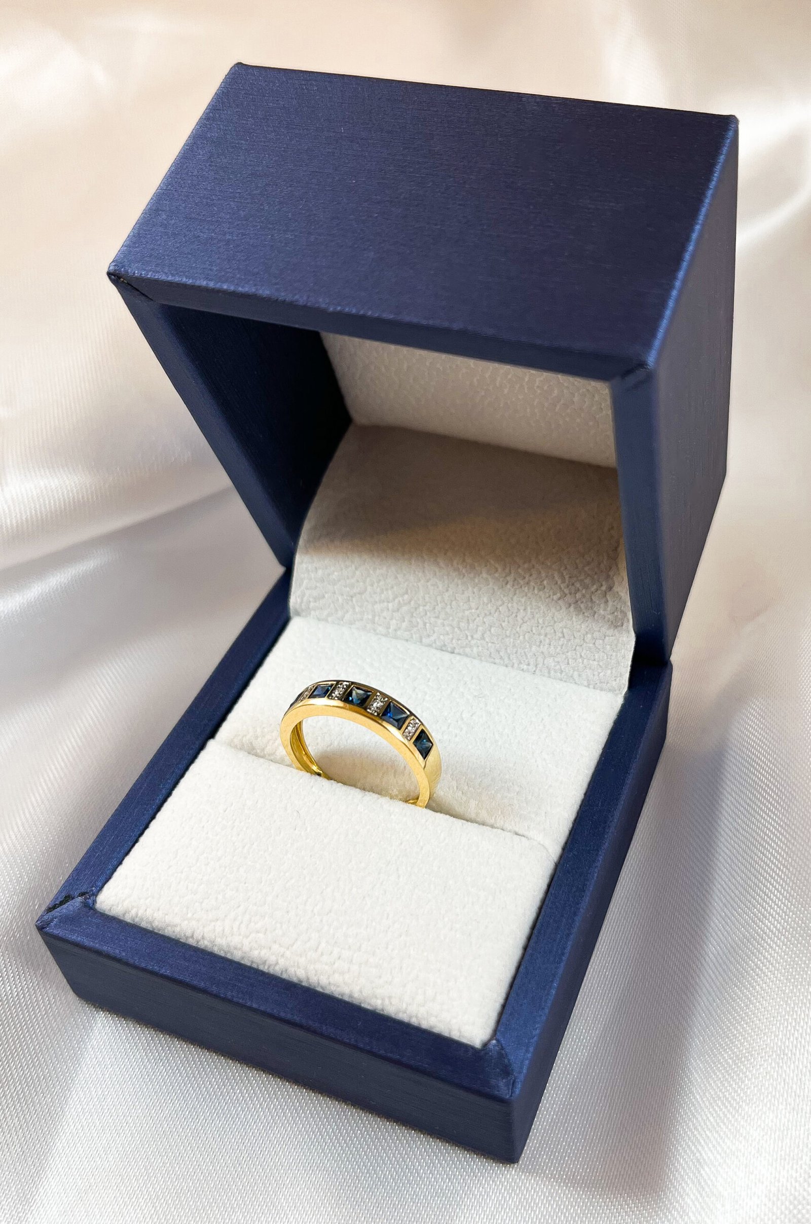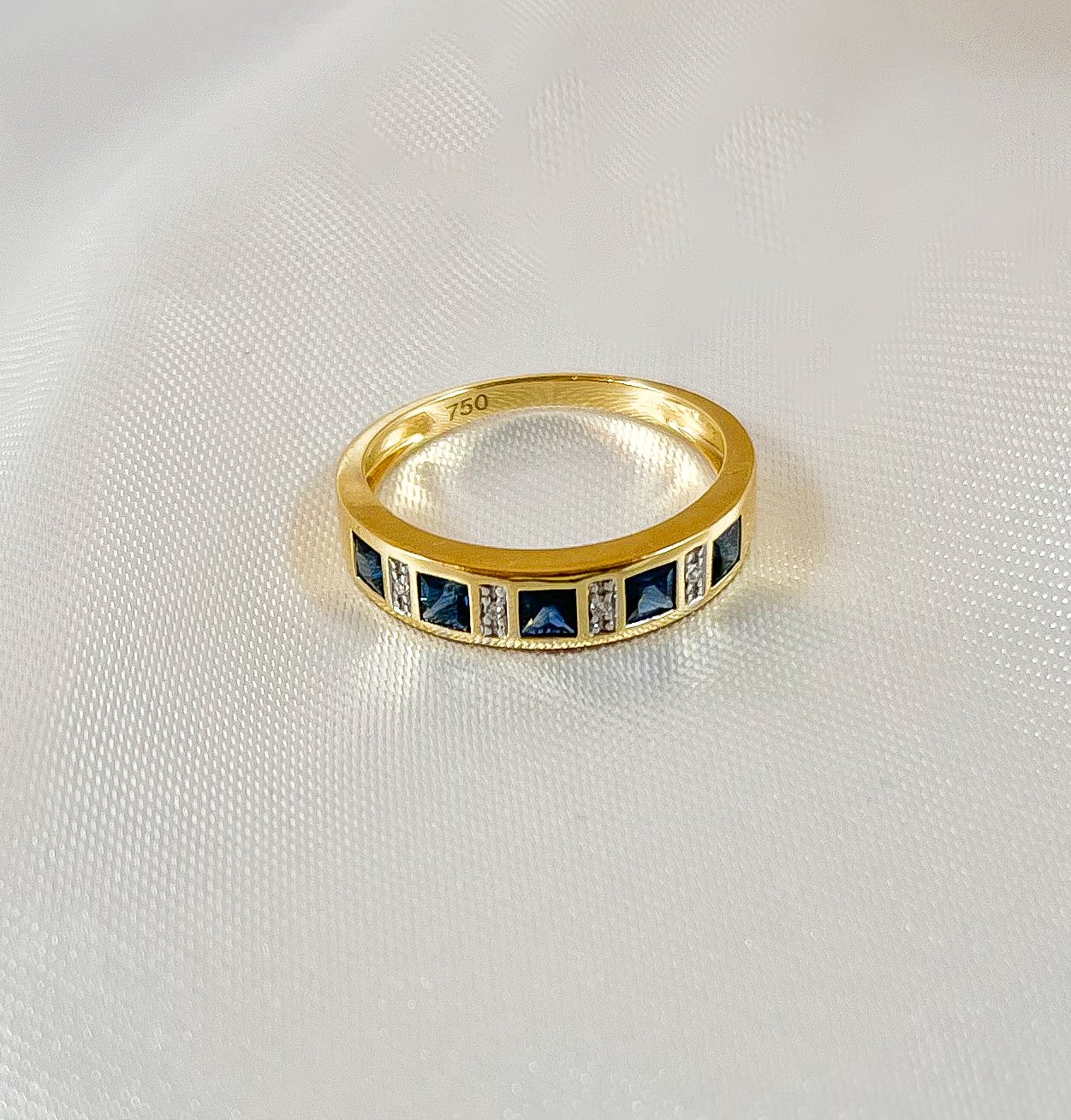 Este elegante Anillo de Oro Amarillo presenta un diseño donde Zafiros de Corte Princesa, de intenso color azul, se alternan con pequeños Diamantes. El engaste bajo o protege las piedras y mantiene un perfil liso.