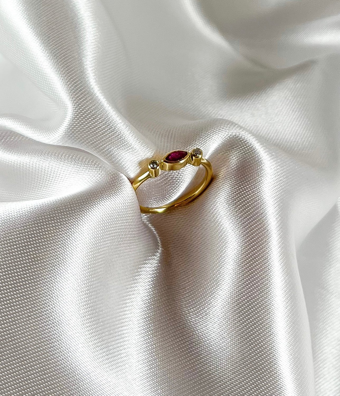 Anillo confeccionado en oro amarillo, con un diseño de tres piedras que incorpora un rubí natural en talla marquesa al centro, flanqueado por dos diamantes naturales en engaste de bisel. La composición simétrica y las terminaciones finas aportan equilibrio visual y una estética refinada.