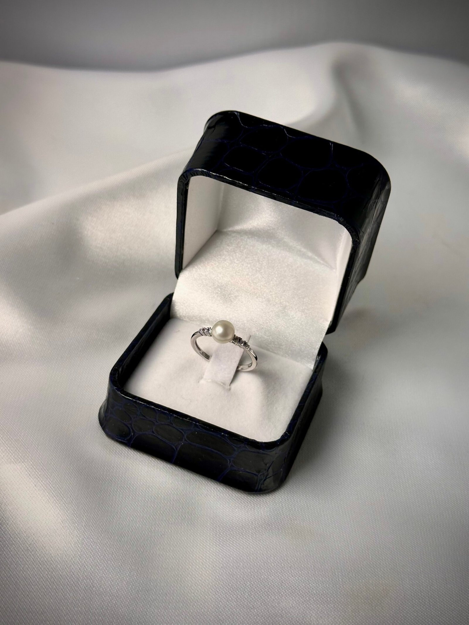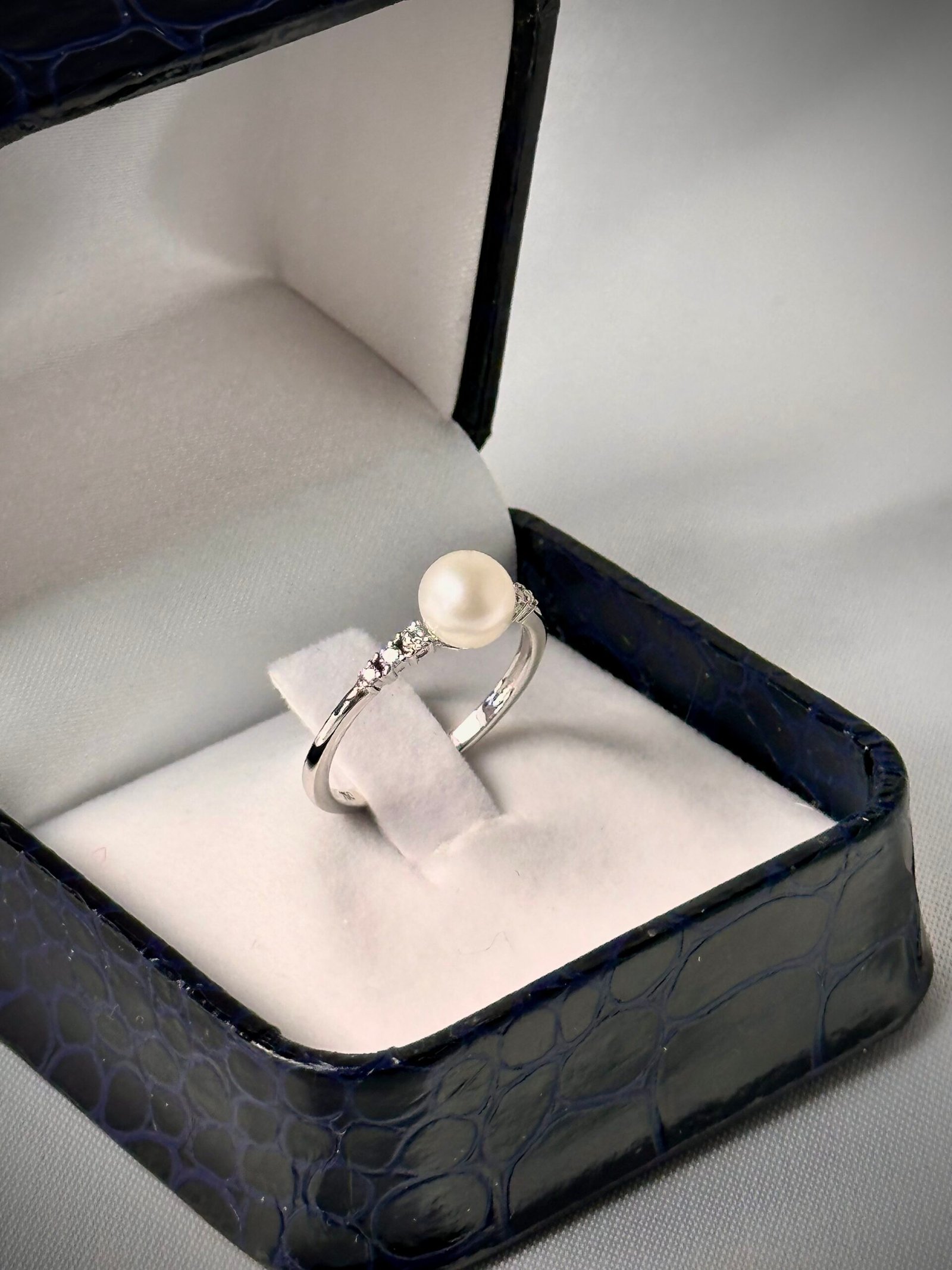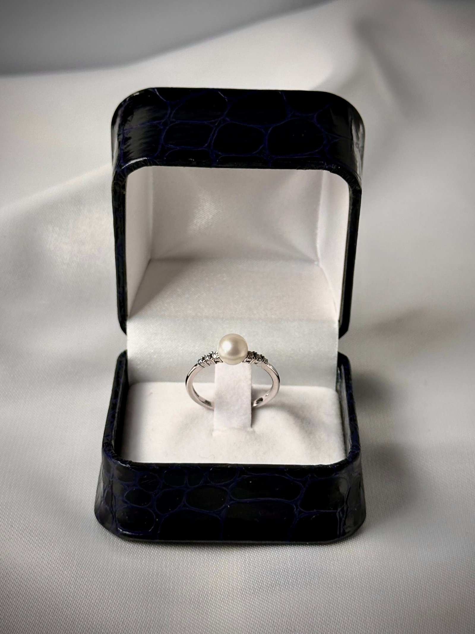 Elegancia clásica y minimalista. Este delicado Anillo de Oro Blanco presenta una Perla Central natural y brillante, flanqueada por seis Diamantes que aportan un destello sutil a lo largo de la banda. Su diseño esbelto lo convierte en una pieza perfecta para un anillo de compromiso o una joya para celebrar un momento especial.