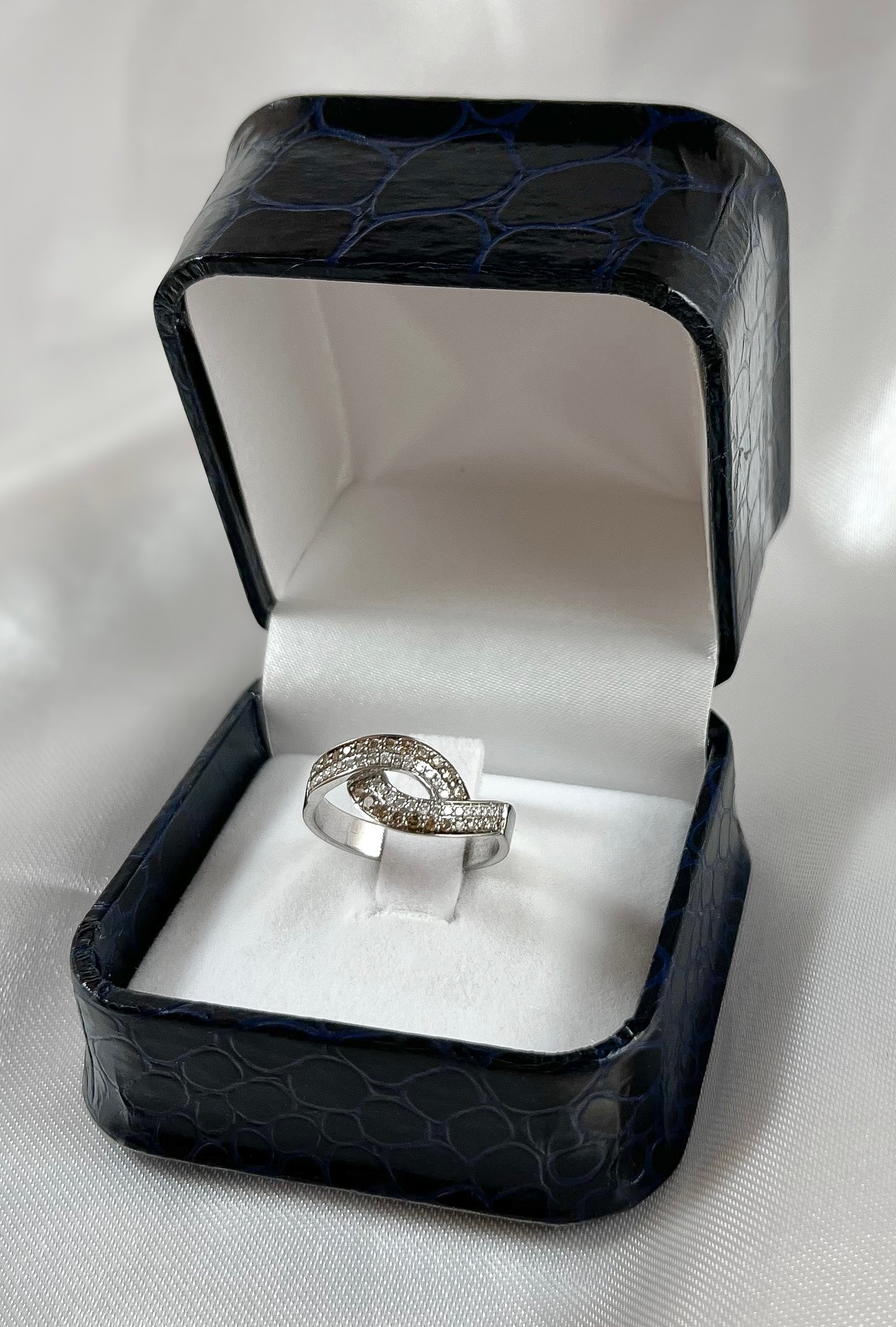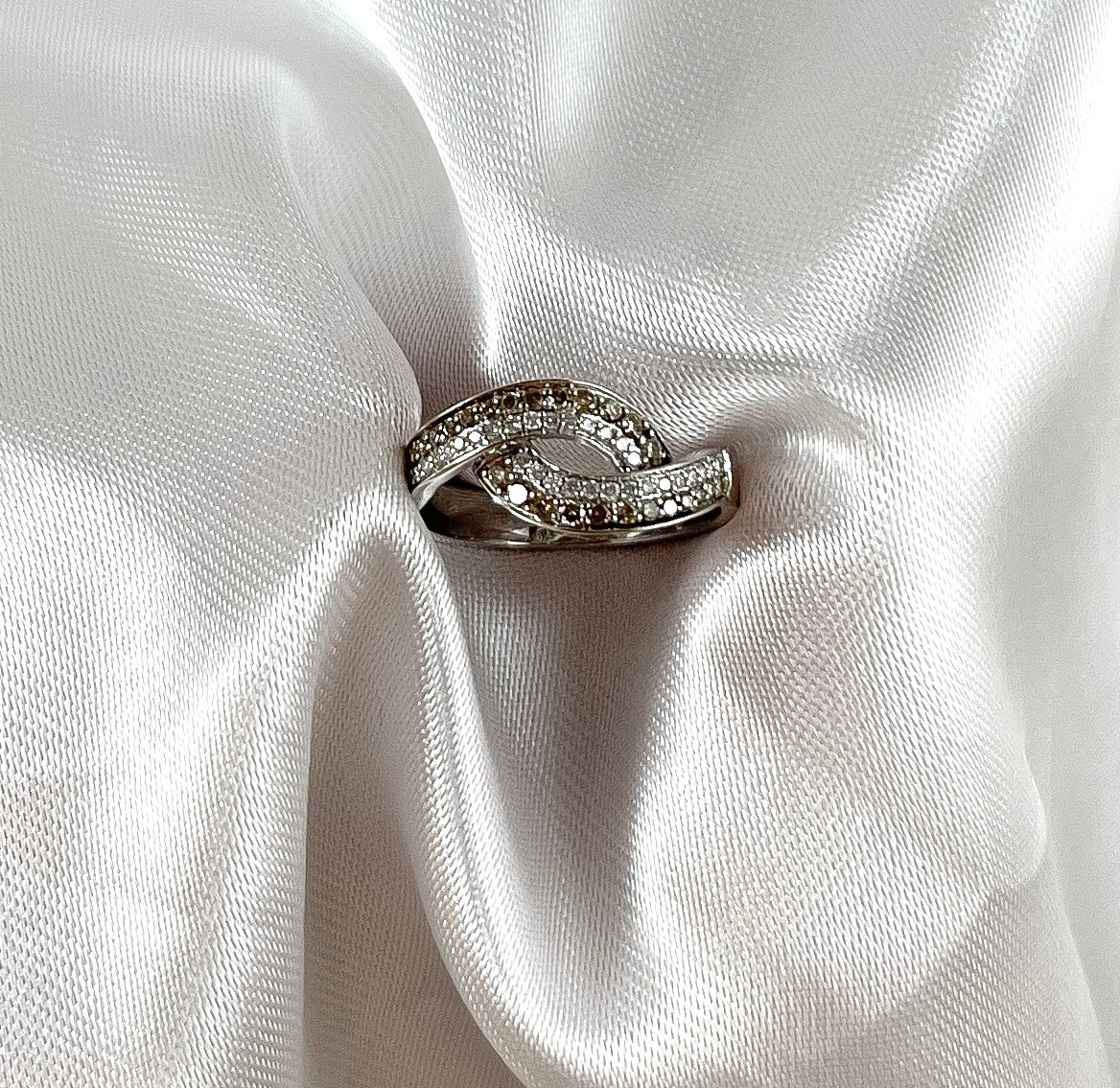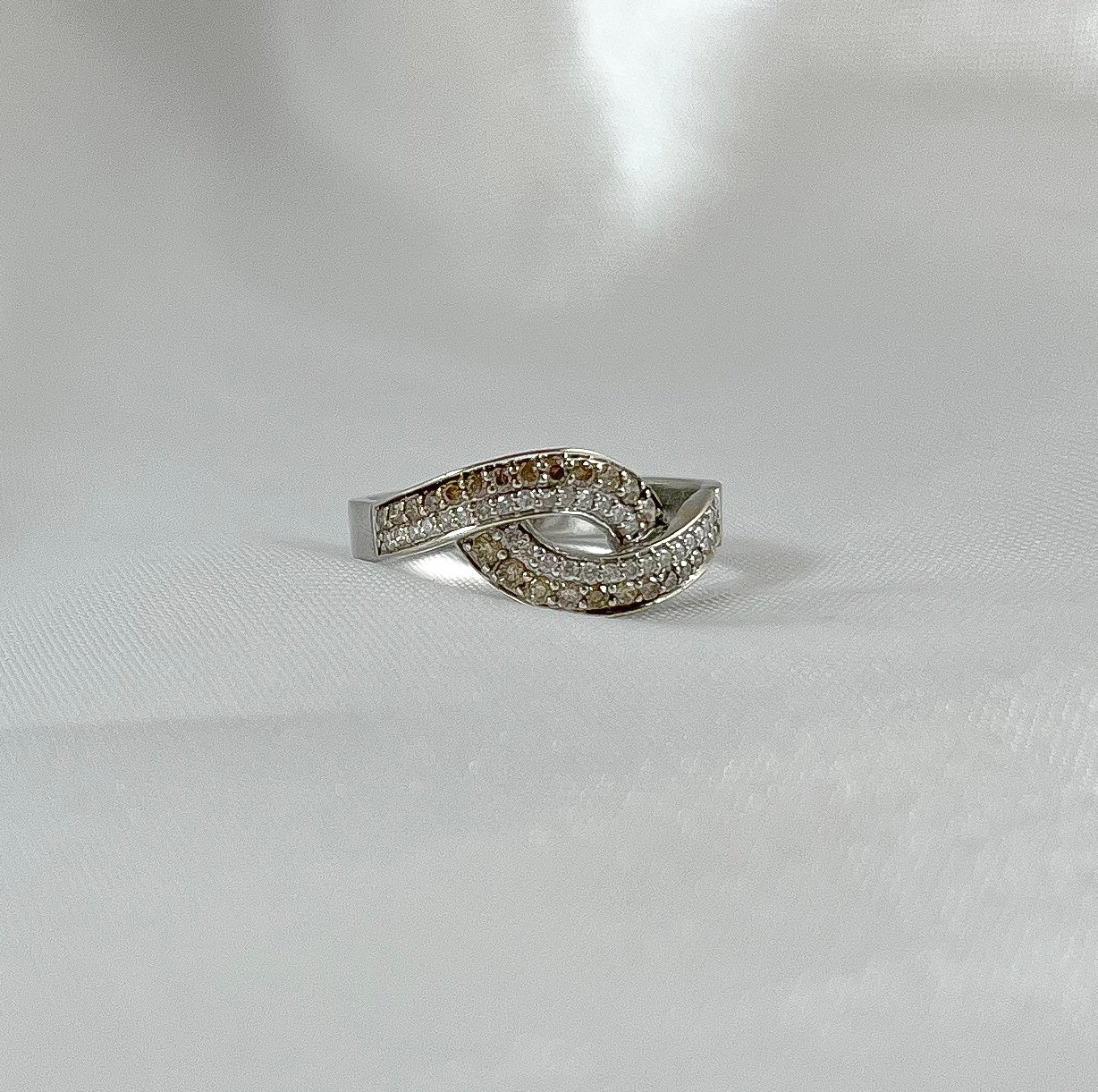 Un diseño dinámico que entrelaza el lujo y el color. Este elegante Anillo de Oro Blanco presenta un diseño cruzado y envolvente. Una banda está adornada con Diamantes, mientras que la otra deslumbra con Diamantes color champagne, creando un sofisticado contraste.