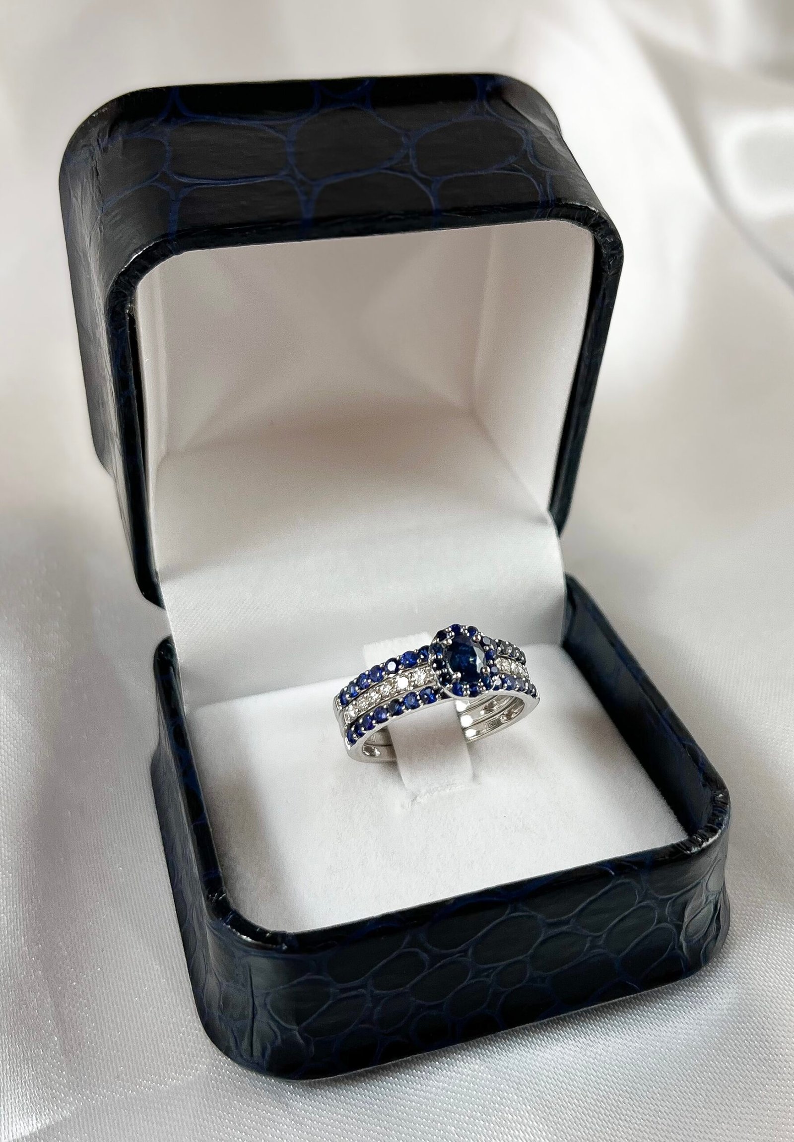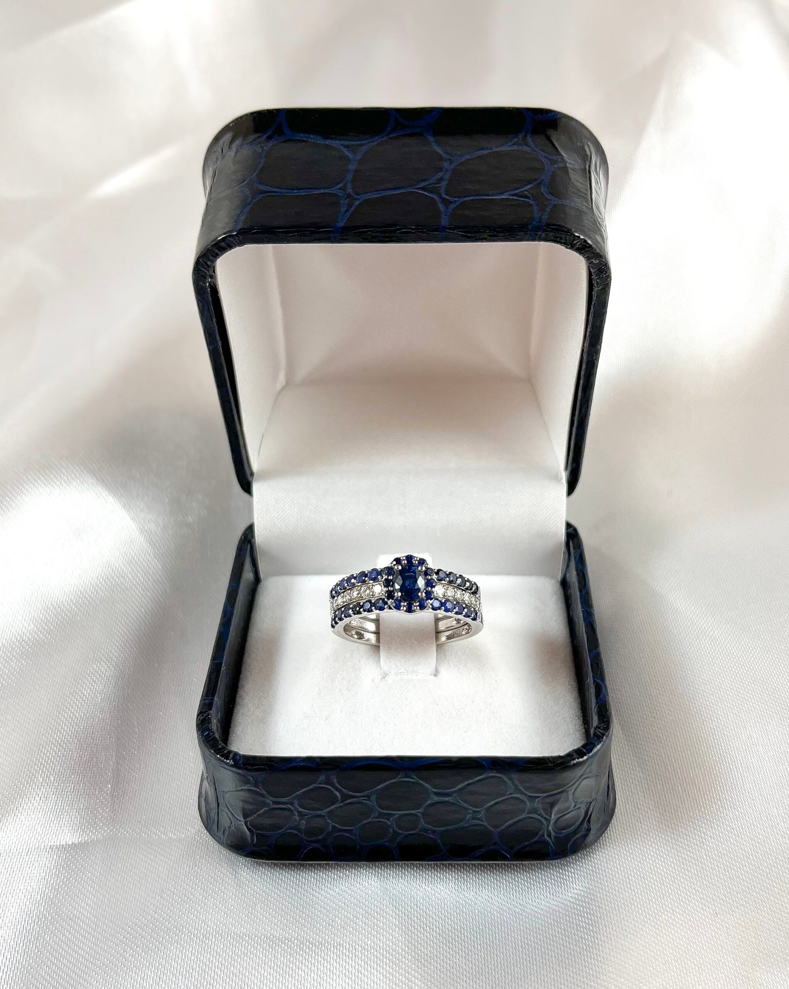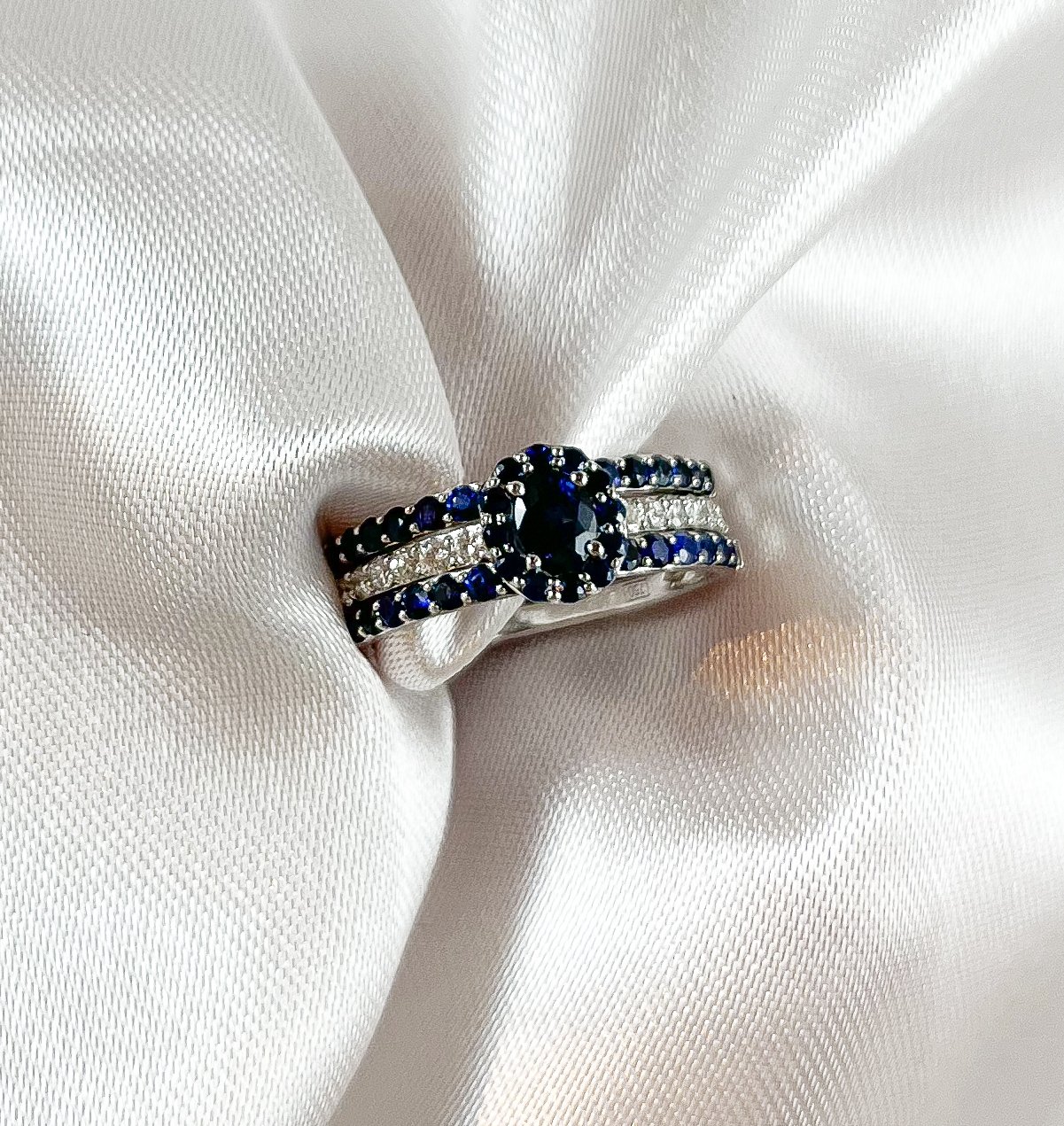 Lujo y profundidad en una sola pieza. Este Anillo de Oro Blanco presenta un Zafiro Central rodeado de un halo de Zafiros más pequeños. El diseño se complementa con Zafiros y Diamantes engastados a lo largo de las bandas, creando un brillo total. Ideal como anillo de compromiso o una joya conmemorativa.