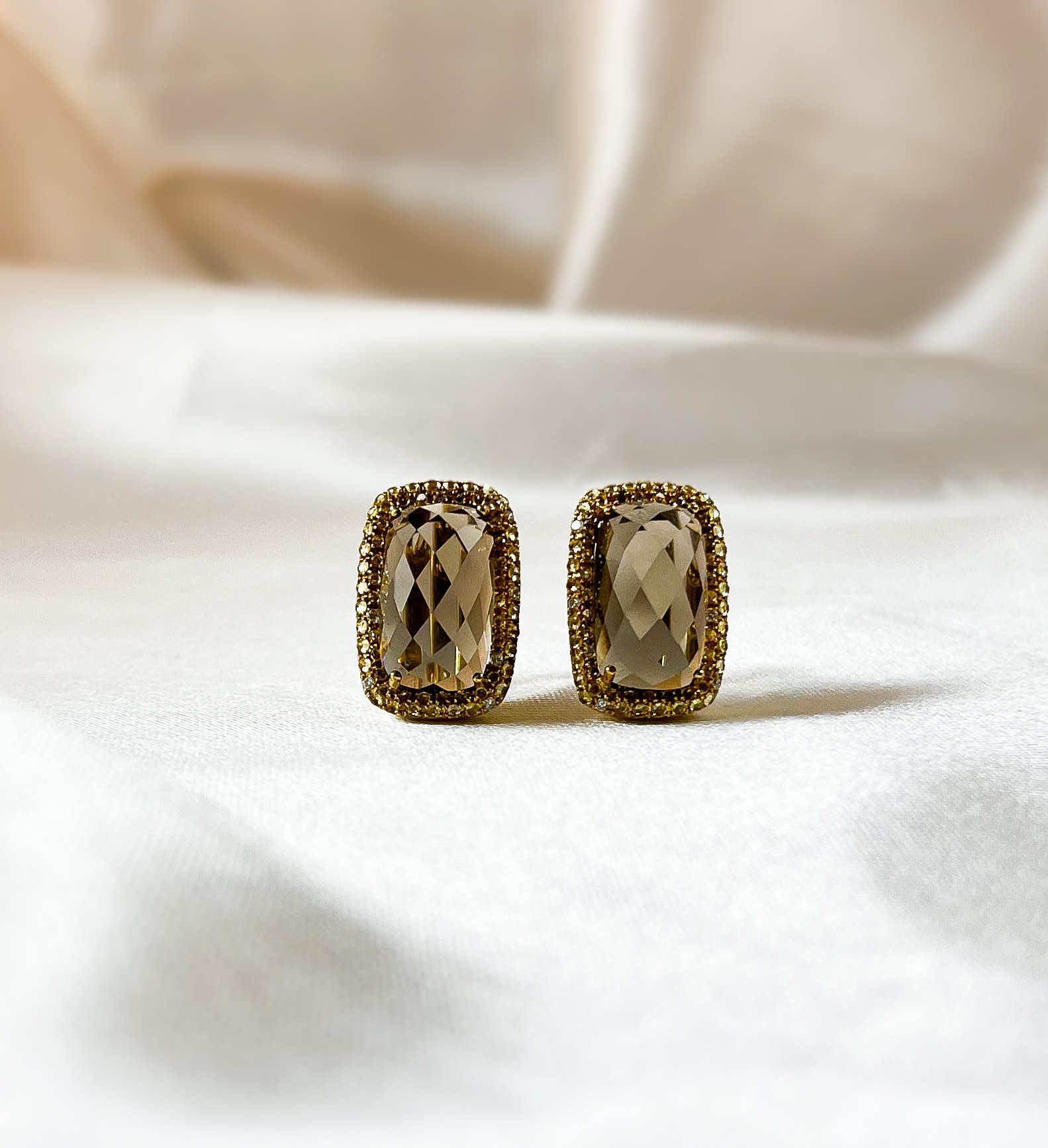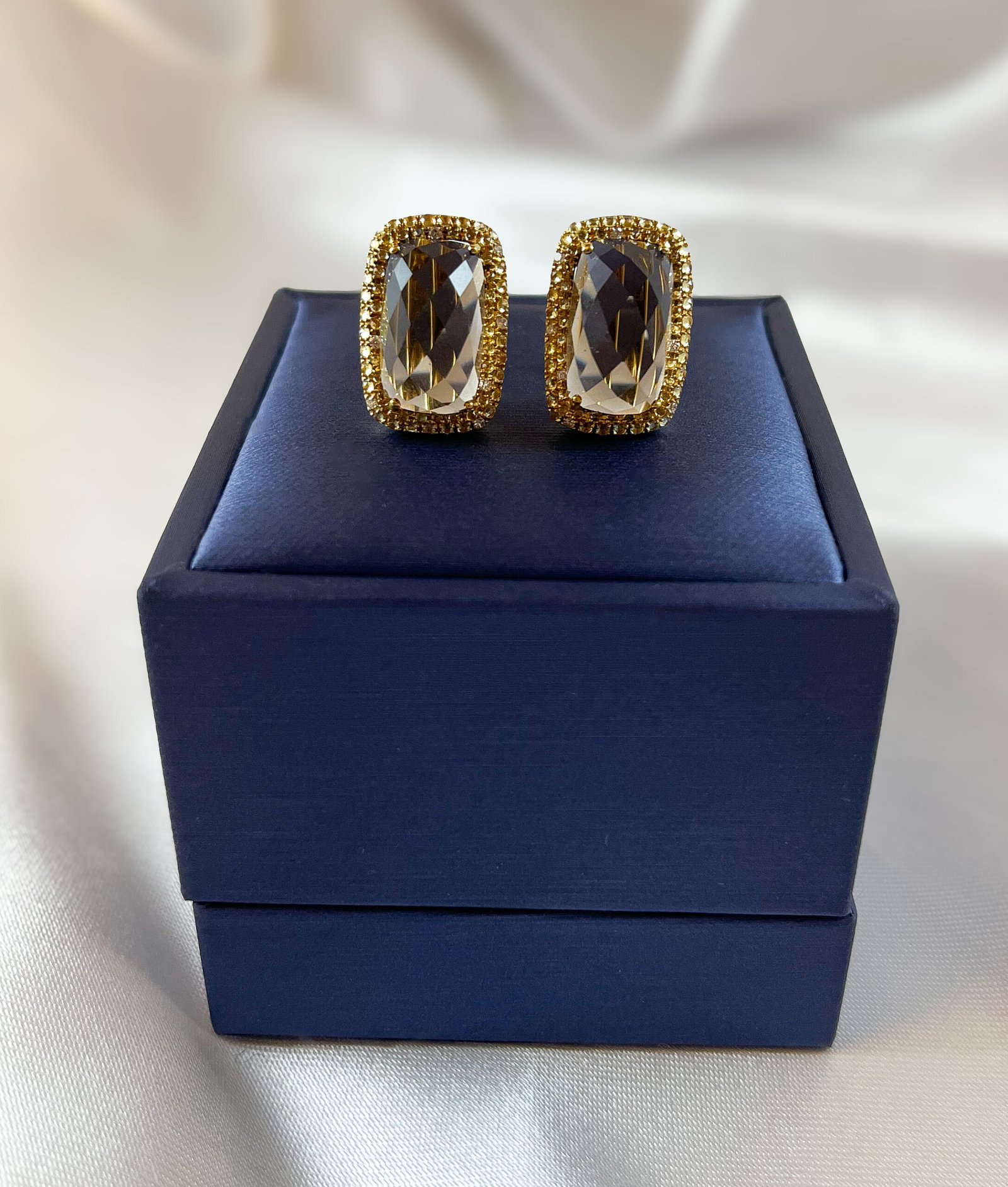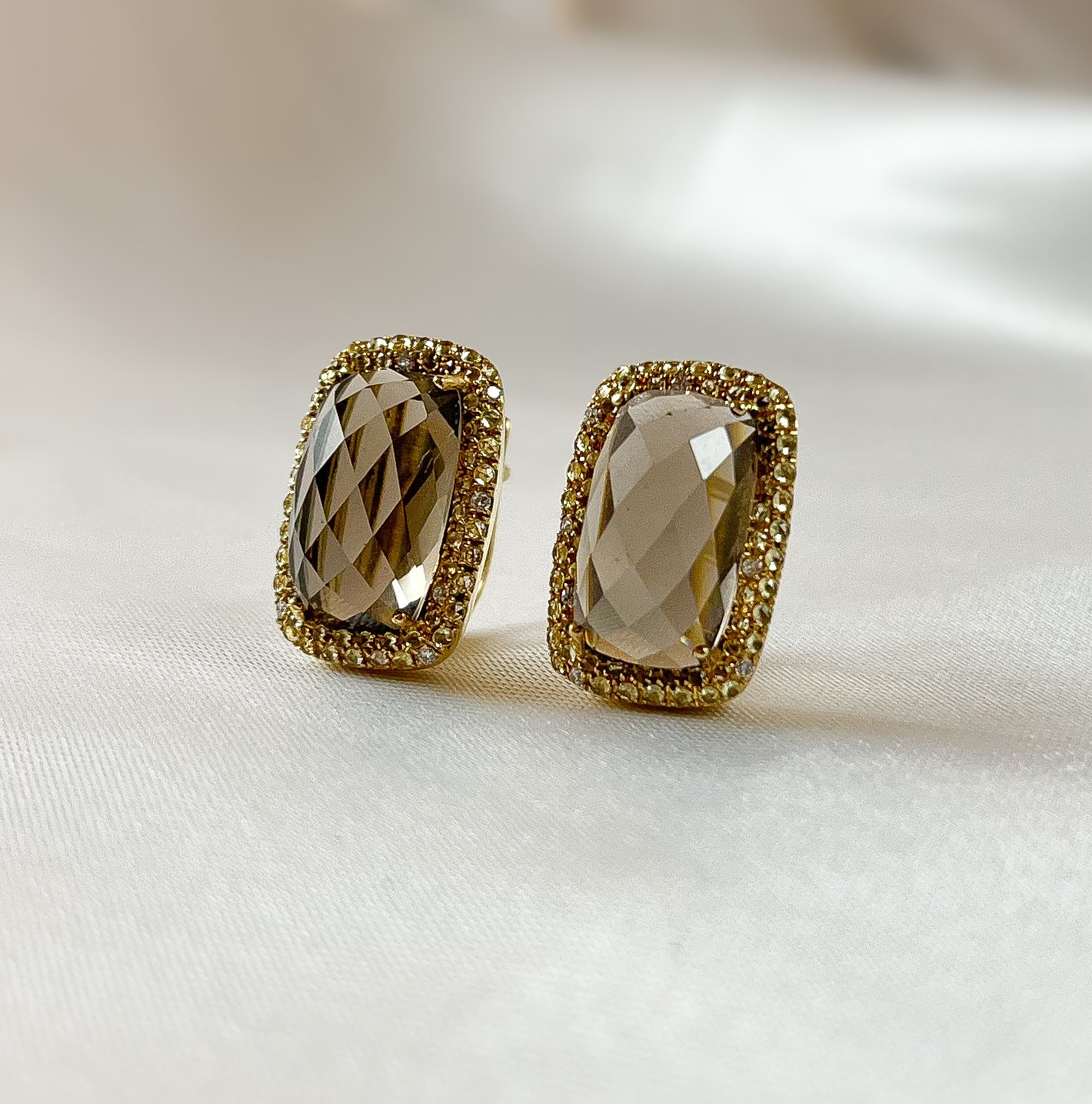 Los Aros Topacio Fumé Corte Imperial presentan un diseño rectangular con bordes redondeados y piedra central facetada en corte alargado. Están enmarcados por un halo de diamantes naturales que resalta el contraste cromático con el topacio fumé. El sistema de cierre aporta firmeza y comodidad sin perder elegancia.