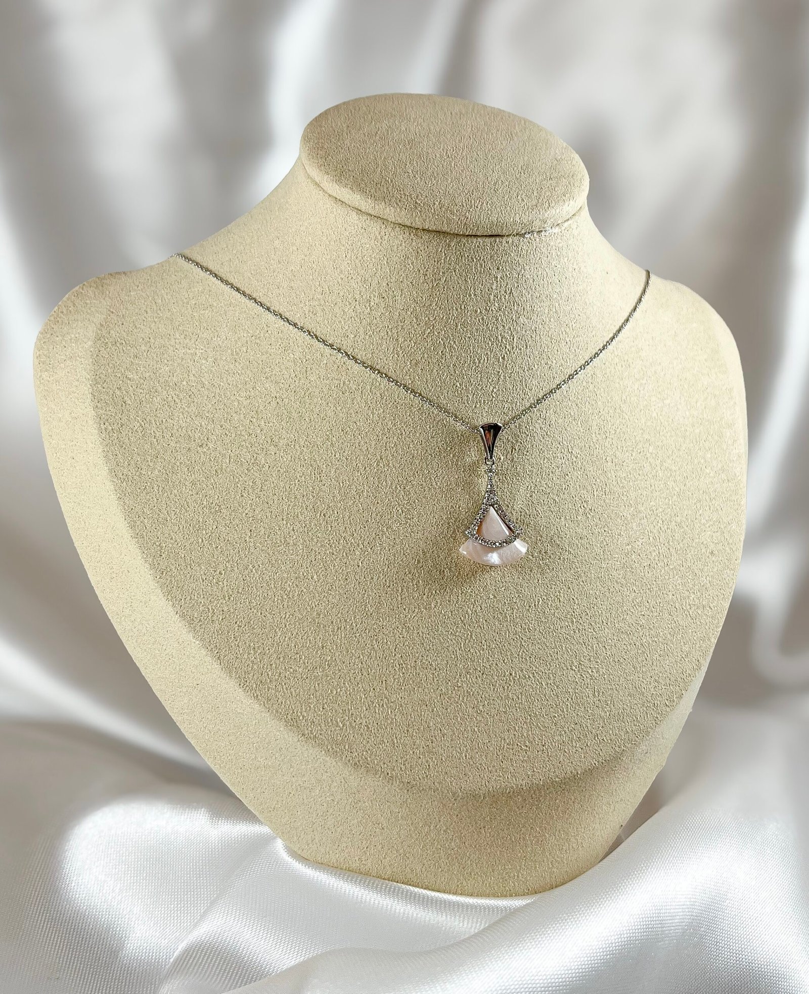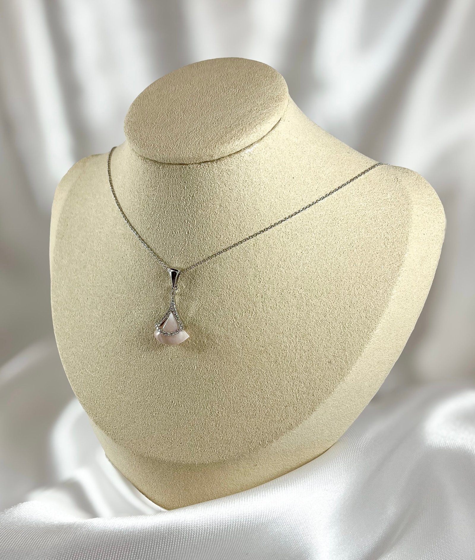 El Colgante Nácar con Diamantes se presenta en una estructura curva de oro blanco, con una pieza central de nácar en tono rosado claro y un borde interior engastado con diamantes naturales. Su silueta estilizada aporta equilibrio y luminosidad, manteniendo un diseño elegante de líneas suaves.