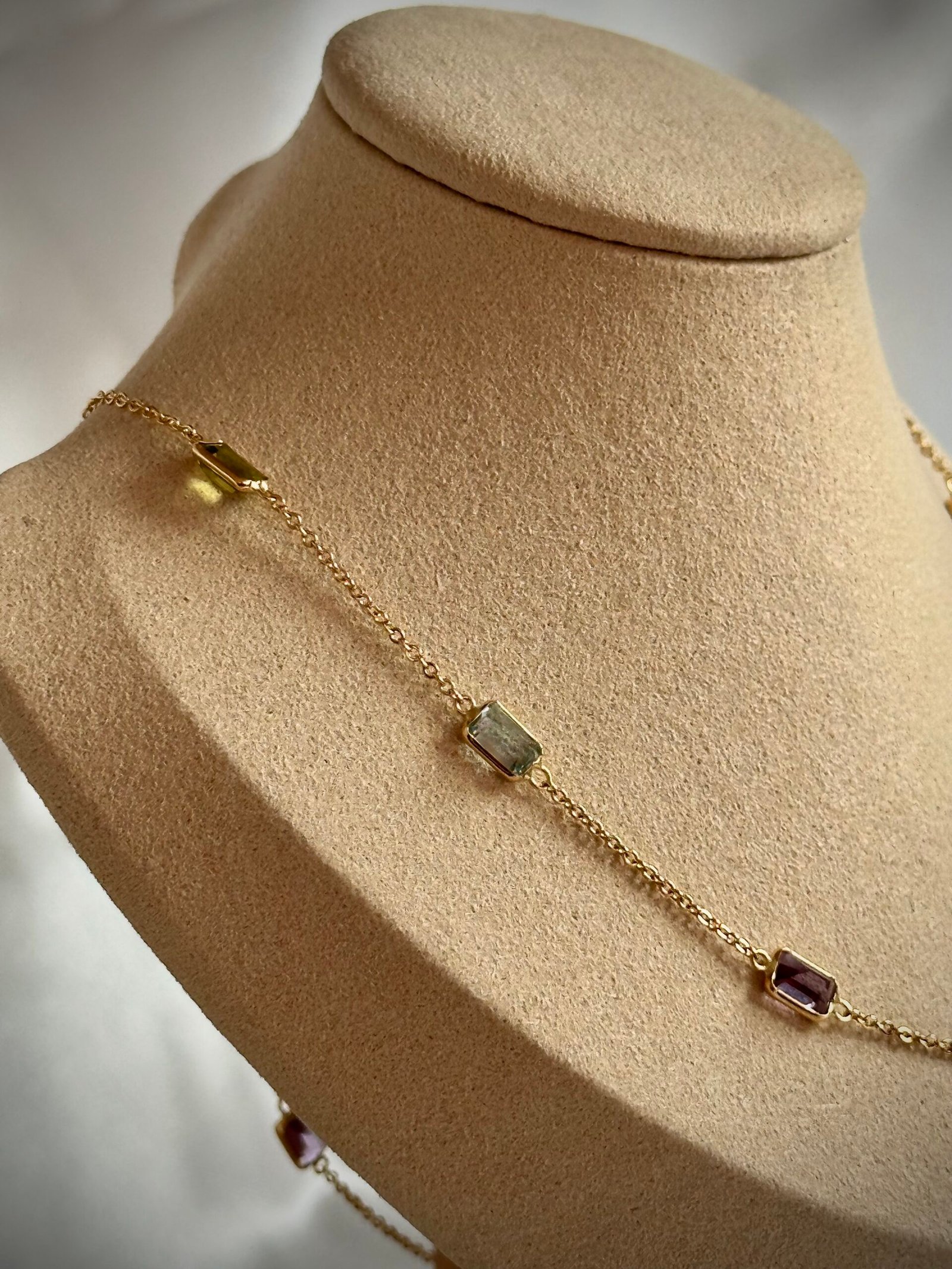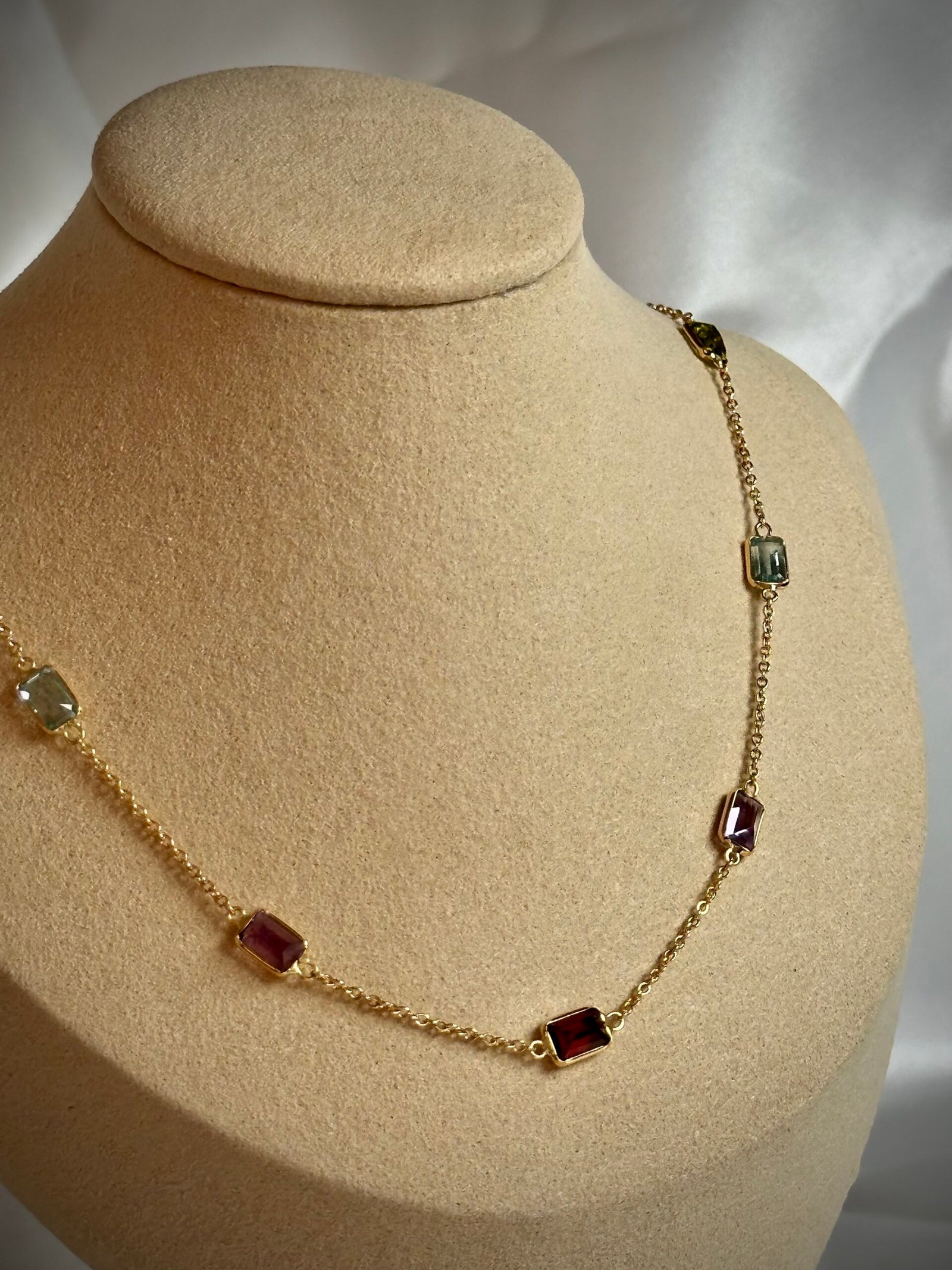 Un diseño dinámico y lleno de color. Este elegante Collar de Oro Amarillo tipo eslabón presenta múltiples piedras semi preciosas de corte rectangular, incluyendo Granate, Citrino y Amatista. El engaste sutil permite que las gemas brillen con intensidad, creando una joya versátil y moderna que es ideal para usar sola o combinada con otros collares.