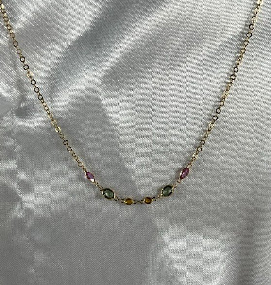 Un destello de color y elegancia. Este collar de oro puro con zafiros multicolor es el equilibrio perfecto entre lujo sutil y estilo vibrante.